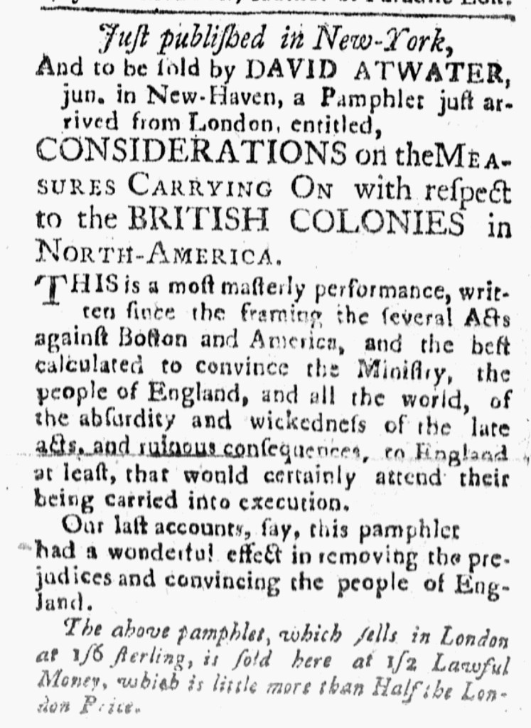 “Just published in New-York, And to be sold … in New-Haven, a Pamphlet just arrived from London.”