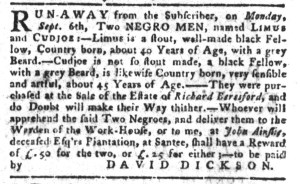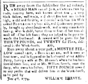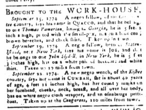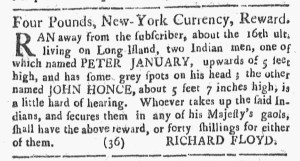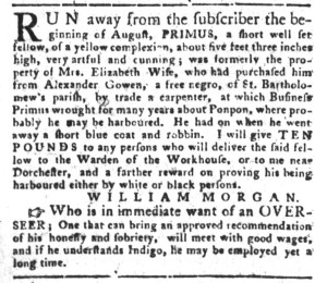 The public prints facilitated that sort of surveillance and oversight of Black people in early America, even in Connecticut and other colonies in New England. Elsewhere in the same issue of the Connecticut Journal, William Smith ran an advertisement that described “a MOLATTO SLAVE, half Negro and half Indian, named DICK” who “RANAWAY from … the South Side of Long-Island” in late August. Dick did not depart alone. An “INDIAN FELLOW, named JOE,” accompanied him, fleeing from Nathaniel Woodhull, though Smith did not specify if Joe was indentured or enslaved. Apparently, he was not free because Smith offered a reward to anyone who “secures him or them in any of his Majesty’s Gaols, or shall bring one or both of them to their Masters.”