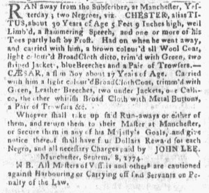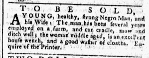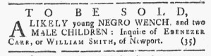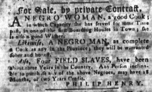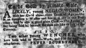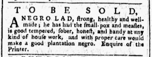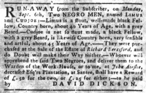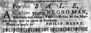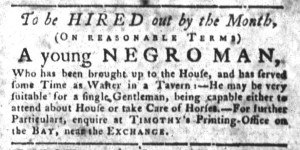 The Slavery Adverts 250 Project chronicles the role of newspaper advertising in perpetuating slavery in the era of the American Revolution. The project seeks to reveal the ubiquity of slavery in eighteenth-century life from New England to Georgia by republishing advertisements about enslaved people – for sale as individuals or in groups, wanted to purchase or for hire for short periods, runaways who liberated themselves, and those who were subsequently captured and confined in jails and workhouses – in daily digests on this site as well as in real time via the @SlaveAdverts250 Twitter feed, utilizing twenty-first-century media to stand in for the print media of the eighteenth century.