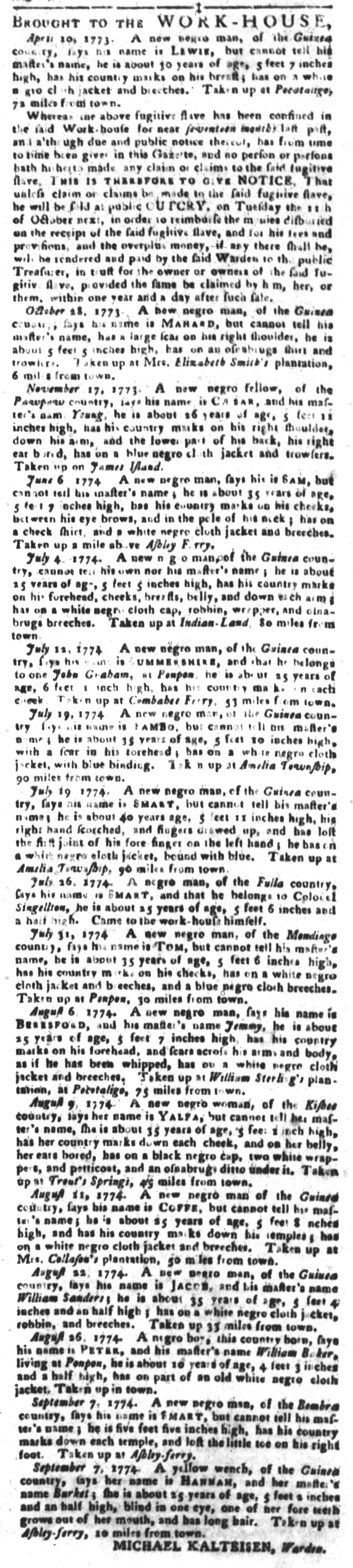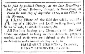 Even with that choice about where to place the colophon, the Halls still recognized the bottom of the final page as valuable space for promoting their newspaper, publishing a perpetual advertisement that ran across all three columns in each issue. A single line advised, “This GAZETTE may be had for 6s. 8d. per Annum, exclusive of Postage – 3s. 4d. (or 4s. 6d. if sent by the Eastern Post) to be paid at Entrance.” Throughout the colonies, printers generously extended credit to subscribers, recognizing that if they increased their circulation then they could attract more advertisers. In turn, printers often published notices calling on subscribers to pay for subscriptions going back months and even years.