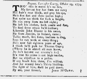 It was a novel means of drawing attention to the description of an indentured servant who ran away from his master. Rather than the usual sort of advertisement that crowded the pages of newspapers from New England to South Carolina, John McGoun rejected writing a paragraph of dense text in favor of composing a series of rhyming couplets that gave readers all sorts of information about John Hunter and offered a reward for imprisoning or returning him. On occasion, aggrieved masters composed and published such poems, yet they were rare enough to merit a closer look when McGoun inserted his advertisement. In the first couplet, he played with the form, asserting that his situation was a serious matter even as he sought to entertain readers so they would take note of the details he presented: “THO’ this is metre it’s no fun, / My servant boy has from me run.”