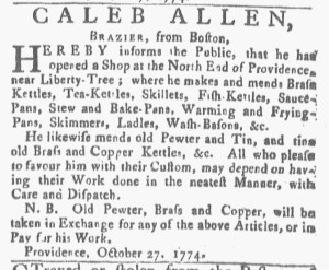 “BRAZIER, from Boston … has opened a Shop at the North of Providence, near Liberty-Tree.”