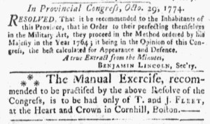 A brief advertisement immediately followed the resolution: “The Manual Exercise, recommended to be practised by the above Resolve of the Congress, is to be had only of T. and J. Fleet, at the Heart and Crown in Cornhill, Boston.” The column returned to news, that lone advertisement embedded between articles. The Fleets happened to be the printers of the Boston Evening-Post, known for their support of the patriot cause. They likely had dual purposes in running the advertisement and selecting where to place it. Supplying the public with a military manual reflected their political principles, yet as entrepreneurs the Fleets also stood to generate revenue from its sale. They served the public good, both in printing the manual and the proximity of their advertisement to the resolution, while also attempting to increase sales in their printing office. Scholars have debated whether printers who sold political tracts during the era of the American Revolution merely seized an opportunity to line their pockets, yet participating in politics and earning their livelihoods were not necessarily mutually exclusive endeavors.