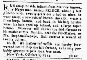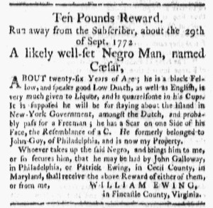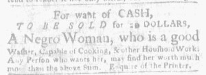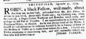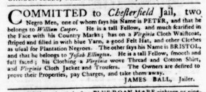 The Slavery Adverts 250 Project chronicles the role of newspaper advertising in perpetuating slavery in the era of the American Revolution. The project seeks to reveal the ubiquity of slavery in eighteenth-century life from New England to Georgia by republishing advertisements about enslaved people – for sale as individuals or in groups, wanted to purchase or for hire for short periods, runaways who liberated themselves, and those who were subsequently captured and confined in jails and workhouses – in daily digests on this site as well as in real time via the @SlaveAdverts250 Twitter feed, utilizing twenty-first-century media to stand in for the print media of the eighteenth century.