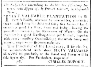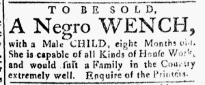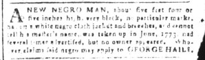 The Slavery Adverts 250 Project chronicles the role of newspaper advertising in perpetuating slavery in the era of the American Revolution. The project seeks to reveal the ubiquity of slavery in eighteenth-century life from New England to Georgia by republishing advertisements about enslaved people – for sale as individuals or in groups, wanted to purchase or for hire for short periods, runaways who liberated themselves, and those who were subsequently captured and confined in jails and workhouses – in daily digests on this site as well as in real time via the @SlaveAdverts250 Twitter feed, utilizing twenty-first-century media to stand in for the print media of the eighteenth century.