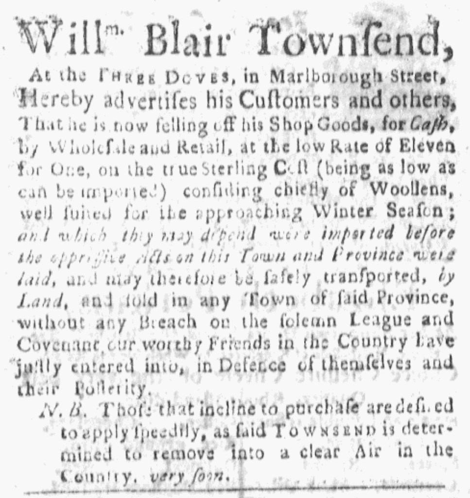 Knowing that was the case, Townsend acknowledged the politics of the moment in his advertisement. He endorsed the pact while also making clear that neither he nor his prospective customers violated it. They could buy and sell with clear consciences … and without attracting the ire of the public. Beyond that, Townsend wished to clear out of Boston. In a nota bene, he encouraged “Those that incline to purchase … to apply speedily” since he “is determined to remove into a clear Air in the Country, very soon.” The situation had grown so bleak that that he did not intend to remain in Boston much longer.