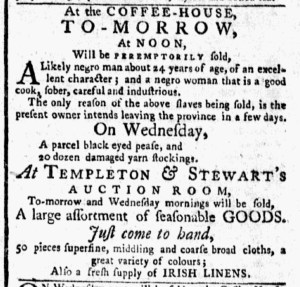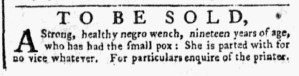 The Slavery Adverts 250 Project chronicles the role of newspaper advertising in perpetuating slavery in the era of the American Revolution. The project seeks to reveal the ubiquity of slavery in eighteenth-century life from New England to Georgia by republishing advertisements about enslaved people – for sale as individuals or in groups, wanted to purchase or for hire for short periods, runaways who liberated themselves, and those who were subsequently captured and confined in jails and workhouses – in daily digests on this site as well as in real time via the @SlaveAdverts250 Twitter feed, utilizing twenty-first-century media to stand in for the print media of the eighteenth century.