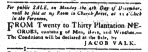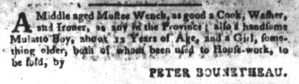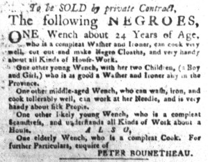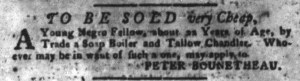 The Slavery Adverts 250 Project chronicles the role of newspaper advertising in perpetuating slavery in the era of the American Revolution. The project seeks to reveal the ubiquity of slavery in eighteenth-century life from New England to Georgia by republishing advertisements about enslaved people – for sale as individuals or in groups, wanted to purchase or for hire for short periods, runaways who liberated themselves, and those who were subsequently captured and confined in jails and workhouses – in daily digests on this site as well as in real time via the @SlaveAdverts250 Twitter feed, utilizing twenty-first-century media to stand in for the print media of the eighteenth century.