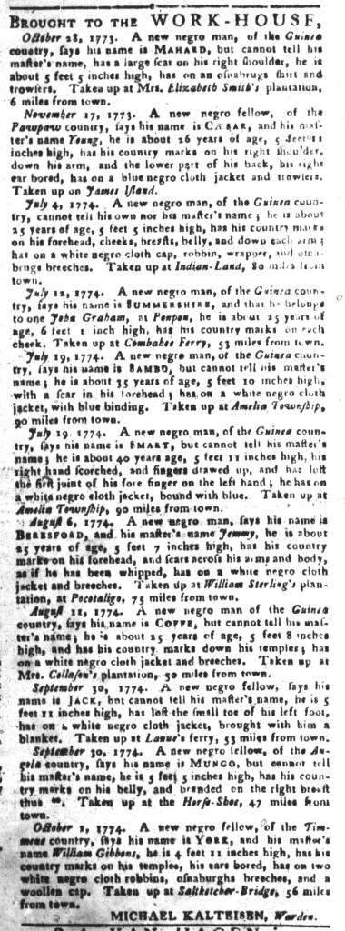 These advertisements also testify to the experiences of enslaved men, women, and children, though readers must consider that those experiences have been remediated through descriptions offered by enslavers rather than enslaved people themselves. Often unnamed in the advertisements, enslaved men, women, and children were not invisible or unimportant in early America.