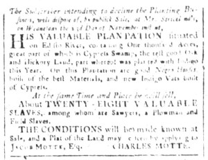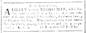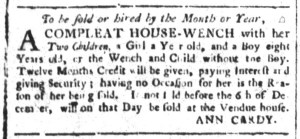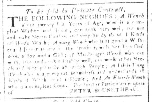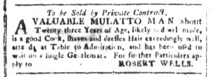 The Slavery Adverts 250 Project chronicles the role of newspaper advertising in perpetuating slavery in the era of the American Revolution. The project seeks to reveal the ubiquity of slavery in eighteenth-century life from New England to Georgia by republishing advertisements about enslaved people – for sale as individuals or in groups, wanted to purchase or for hire for short periods, runaways who liberated themselves, and those who were subsequently captured and confined in jails and workhouses – in daily digests on this site as well as in real time via the @SlaveAdverts250 Twitter feed, utilizing twenty-first-century media to stand in for the print media of the eighteenth century.