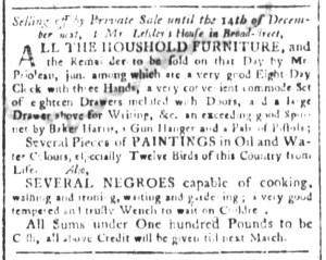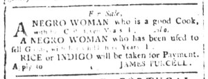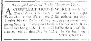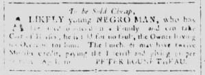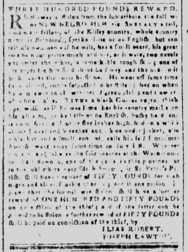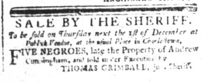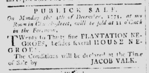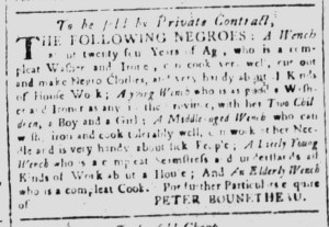 The Slavery Adverts 250 Project chronicles the role of newspaper advertising in perpetuating slavery in the era of the American Revolution. The project seeks to reveal the ubiquity of slavery in eighteenth-century life from New England to Georgia by republishing advertisements about enslaved people – for sale as individuals or in groups, wanted to purchase or for hire for short periods, runaways who liberated themselves, and those who were subsequently captured and confined in jails and workhouses – in daily digests on this site as well as in real time via the @SlaveAdverts250 Twitter feed, utilizing twenty-first-century media to stand in for the print media of the eighteenth century.