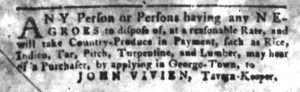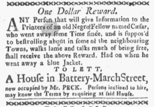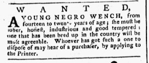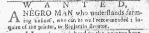 The Slavery Adverts 250 Project chronicles the role of newspaper advertising in perpetuating slavery in the era of the American Revolution. The project seeks to reveal the ubiquity of slavery in eighteenth-century life from New England to Georgia by republishing advertisements about enslaved people – for sale as individuals or in groups, wanted to purchase or for hire for short periods, runaways who liberated themselves, and those who were subsequently captured and confined in jails and workhouses – in daily digests on this site as well as in real time via the @SlaveAdverts250 Twitter feed, utilizing twenty-first-century media to stand in for the print media of the eighteenth century.