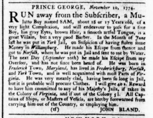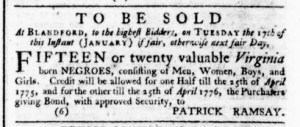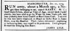 The Slavery Adverts 250 Project chronicles the role of newspaper advertising in perpetuating slavery in the era of the American Revolution. The project seeks to reveal the ubiquity of slavery in eighteenth-century life from New England to Georgia by republishing advertisements about enslaved people – for sale as individuals or in groups, wanted to purchase or for hire for short periods, runaways who liberated themselves, and those who were subsequently captured and confined in jails and workhouses – in daily digests on this site as well as in real time via the @SlaveAdverts250 Twitter feed, utilizing twenty-first-century media to stand in for the print media of the eighteenth century.