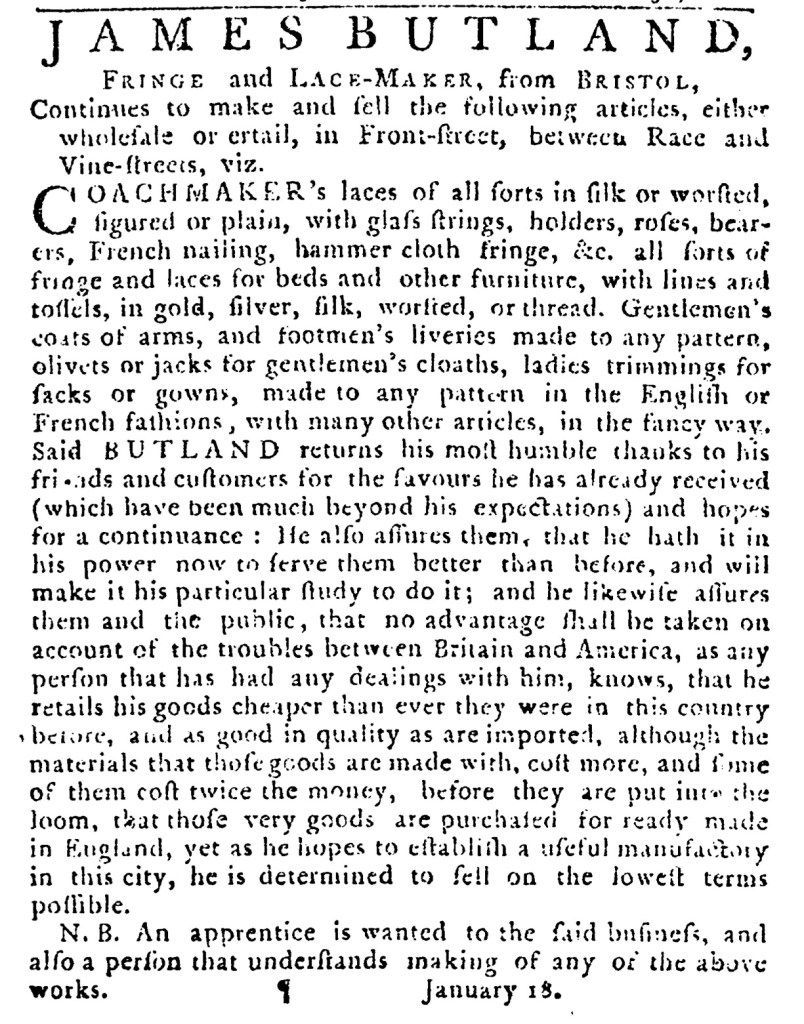 James Butland, a “FRINGE and LACE-MAKER, from BRISTOL,” set up shop in Philadelphia in the 1770s.  In an advertisement in the February 1, 1775, edition of the Pennsylvania Journal, he informed the public that he made and sold “COACHMAKER’s laces of all sorts in silk or worsted,” “all sorts of fringe and laces for beds and other furniture,” and other trimmings according to “any pattern in the English or French fashions.”