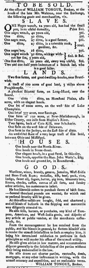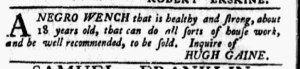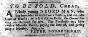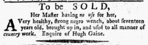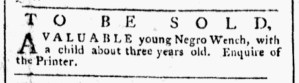The Slavery Adverts 250 Project chronicles the role of newspaper advertising in perpetuating slavery in the era of the American Revolution. The project seeks to reveal the ubiquity of slavery in eighteenth-century life from New England to Georgia by republishing advertisements about enslaved people – for sale as individuals or in groups, wanted to purchase or for hire for short periods, runaways who liberated themselves, and those who were subsequently captured and confined in jails and workhouses – in daily digests on this site as well as in real time via the @SlaveAdverts250 Twitter feed, utilizing twenty-first-century media to stand in for the print media of the eighteenth century.