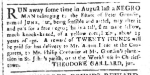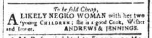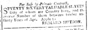 The Slavery Adverts 250 Project chronicles the role of newspaper advertising in perpetuating slavery in the era of the American Revolution. The project seeks to reveal the ubiquity of slavery in eighteenth-century life from New England to Georgia by republishing advertisements about enslaved people – for sale as individuals or in groups, wanted to purchase or for hire for short periods, runaways who liberated themselves, and those who were subsequently captured and confined in jails and workhouses – in daily digests on this site as well as in real time via the @SlaveAdverts250 Twitter feed, utilizing twenty-first-century media to stand in for the print media of the eighteenth century.
