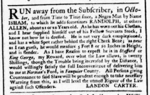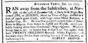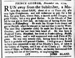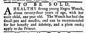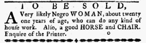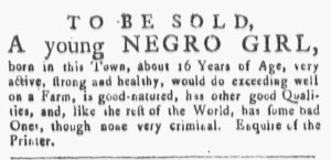 The Slavery Adverts 250 Project chronicles the role of newspaper advertising in perpetuating slavery in the era of the American Revolution. The project seeks to reveal the ubiquity of slavery in eighteenth-century life from New England to Georgia by republishing advertisements about enslaved people – for sale as individuals or in groups, wanted to purchase or for hire for short periods, runaways who liberated themselves, and those who were subsequently captured and confined in jails and workhouses – in daily digests on this site as well as in real time via the @SlaveAdverts250 Twitter feed, utilizing twenty-first-century media to stand in for the print media of the eighteenth century.