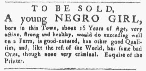 The Slavery Adverts 250 Project chronicles the role of newspaper advertising in perpetuating slavery in the era of the American Revolution. The project seeks to reveal the ubiquity of slavery in eighteenth-century life from New England to Georgia by republishing advertisements about enslaved people – for sale as individuals or in groups, wanted to purchase or for hire for short periods, runaways who liberated themselves, and those who were subsequently captured and confined in jails and workhouses – in daily digests on this site as well as in real time via the @SlaveAdverts250 Twitter feed, utilizing twenty-first-century media to stand in for the print media of the eighteenth century.