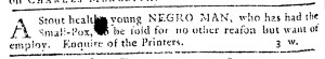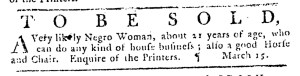 The Slavery Adverts 250 Project chronicles the role of newspaper advertising in perpetuating slavery in the era of the American Revolution. The project seeks to reveal the ubiquity of slavery in eighteenth-century life from New England to Georgia by republishing advertisements about enslaved people – for sale as individuals or in groups, wanted to purchase or for hire for short periods, runaways who liberated themselves, and those who were subsequently captured and confined in jails and workhouses – in daily digests on this site as well as in real time via the @SlaveAdverts250 Twitter feed, utilizing twenty-first-century media to stand in for the print media of the eighteenth century.