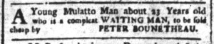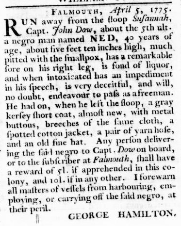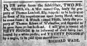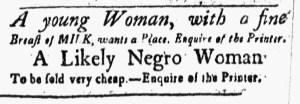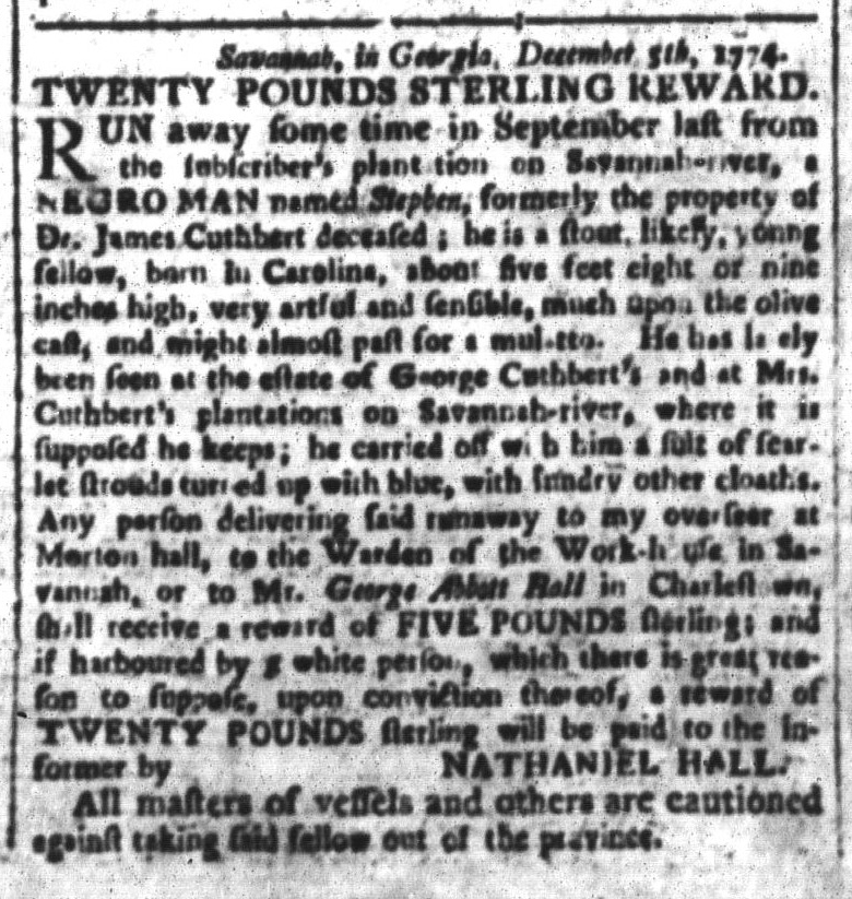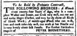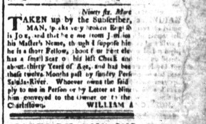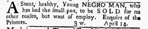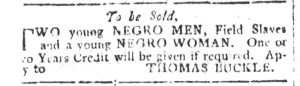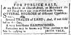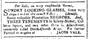The Slavery Adverts 250 Project chronicles the role of newspaper advertising in perpetuating slavery in the era of the American Revolution. The project seeks to reveal the ubiquity of slavery in eighteenth-century life from New England to Georgia by republishing advertisements about enslaved people – for sale as individuals or in groups, wanted to purchase or for hire for short periods, runaways who liberated themselves, and those who were subsequently captured and confined in jails and workhouses – in daily digests on this site as well as in real time via the @SlaveAdverts250 Twitter feed, utilizing twenty-first-century media to stand in for the print media of the eighteenth century.
