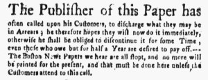 […] “The Boston News Papers we hear are all stopt, and no more will be printed for the present,” Fowle noted, “and that must be done here unless the Customers attend to this call.” Two weeks later, he […]
