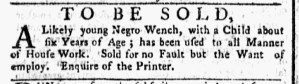 The Slavery Adverts 250 Project chronicles the role of newspaper advertising in perpetuating slavery in the era of the American Revolution. The project seeks to reveal the ubiquity of slavery in eighteenth-century life from New England to Georgia by republishing advertisements about enslaved people – for sale as individuals or in groups, wanted to purchase or for hire for short periods, runaways who liberated themselves, and those who were subsequently captured and confined in jails and workhouses – in daily digests on this site as well as in real time via the @SlaveAdverts250 Twitter feed, utilizing twenty-first-century media to stand in for the print media of the eighteenth century.