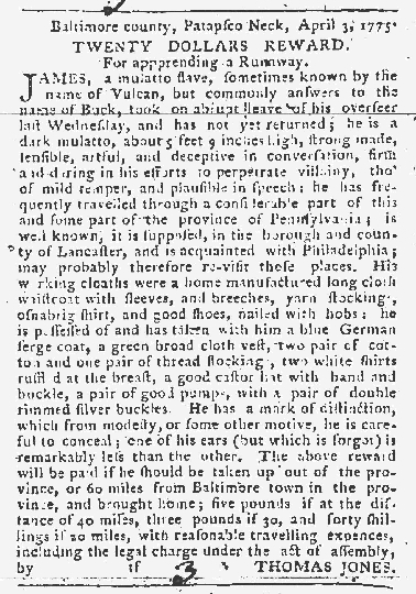 The Slavery Adverts 250 Project chronicles the role of newspaper advertising in perpetuating slavery in the era of the American Revolution. The project seeks to reveal the ubiquity of slavery in eighteenth-century life from New England to Georgia by republishing advertisements about enslaved people – for sale as individuals or in groups, wanted to purchase or for hire for short periods, runaways who liberated themselves, and those who were subsequently captured and confined in jails and workhouses – in daily digests on this site as well as in real time via the @SlaveAdverts250 Twitter feed, utilizing twenty-first-century media to stand in for the print media of the eighteenth century.