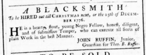The Slavery Adverts 250 Project chronicles the role of newspaper advertising in perpetuating slavery in the era of the American Revolution. The project seeks to reveal the ubiquity of slavery in eighteenth-century life from New England to Georgia by republishing advertisements about enslaved people – for sale as individuals or in groups, wanted to purchase or for hire for short periods, runaways who liberated themselves, and those who were subsequently captured and confined in jails and workhouses – in daily digests on this site as well as in real time via the @SlaveAdverts250 Twitter feed, utilizing twenty-first-century media to stand in for the print media of the eighteenth century.