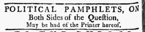 Although Humphreys advertised political pamphlets from “Both Sides” on May 20, word of what happened to Rivington may have prompted him to reconsider his courage in the weeks and months that followed.  He discontinued that advertisement.  In the next issue, he marketed only one pamphlet for sale at his printing office, The Group, a satire by Mercy Otis Warren that depicted a “SCENE AT BOSTON.”  That publication unabashedly supported the American cause.  A week later, that advertisement appeared on the first page of the Pennsylvania Ledger (as it had in the May 20 edition that carried the advertisement for political pamphlets on the final page), next to an advertisement for a multi-volume set of Political Disquisitions recommended for “all the friends of Constitutional Liberty, whether Britons or Americans.”  Still, the editorial perspective of the Pennsylvania Ledger, according to Isaiah Thomas, “was under the influence of the British government” and Humphreys eventually “refused to bear arms in favor of his country, and against the government of England.”[1]  He experienced sufficient difficulty that he suspended the newspaper at the end of November 1776.  In May 1775, a year and a half earlier, he grappled with what kinds of publications he would promote among the advertisements in his newspaper, first forging ahead with notices for pamphlets representing multiple perspectives and then emphasizing those that supported the American cause, perhaps doing so in hopes of avoiding the treatment that Rivington received.