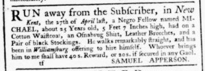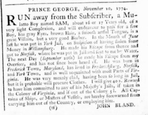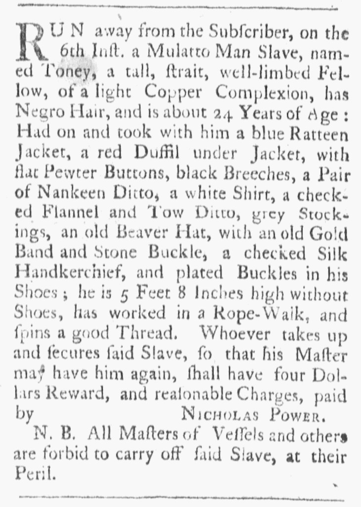 The Slavery Adverts 250 Project chronicles the role of newspaper advertising in perpetuating slavery in the era of the American Revolution. The project seeks to reveal the ubiquity of slavery in eighteenth-century life from New England to Georgia by republishing advertisements about enslaved people – for sale as individuals or in groups, wanted to purchase or for hire for short periods, runaways who liberated themselves, and those who were subsequently captured and confined in jails and workhouses – in daily digests on this site as well as in real time via the @SlaveAdverts250 Twitter feed, utilizing twenty-first-century media to stand in for the print media of the eighteenth century.