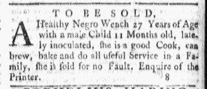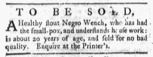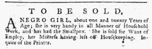 The Slavery Adverts 250 Project chronicles the role of newspaper advertising in perpetuating slavery in the era of the American Revolution. The project seeks to reveal the ubiquity of slavery in eighteenth-century life from New England to Georgia by republishing advertisements about enslaved people – for sale as individuals or in groups, wanted to purchase or for hire for short periods, runaways who liberated themselves, and those who were subsequently captured and confined in jails and workhouses – in daily digests on this site as well as in real time via the @SlaveAdverts250 Twitter feed, utilizing twenty-first-century media to stand in for the print media of the eighteenth century.