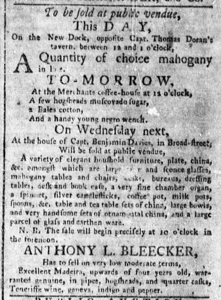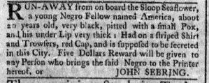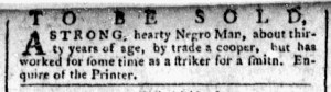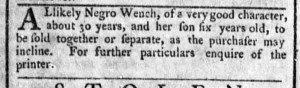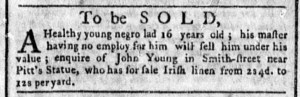 The Slavery Adverts 250 Project chronicles the role of newspaper advertising in perpetuating slavery in the era of the American Revolution. The project seeks to reveal the ubiquity of slavery in eighteenth-century life from New England to Georgia by republishing advertisements about enslaved people – for sale as individuals or in groups, wanted to purchase or for hire for short periods, runaways who liberated themselves, and those who were subsequently captured and confined in jails and workhouses – in daily digests on this site as well as in real time via the @SlaveAdverts250 Twitter feed, utilizing twenty-first-century media to stand in for the print media of the eighteenth century.
