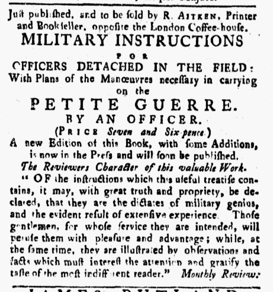 It was a timely volume for the summer of 1775. The June 24 edition of the Pennsylvania Ledger carried an advertisement for Military Instructions for Officers Detached in the Field: With Plans of the Manoeuvres Necessary in Carrying on the Petite Guerre. Robert Aitken, a printer and bookseller in Philadelphia, published and sold an American edition of a book that had been successful enough in England to go to a second edition the previous year.