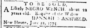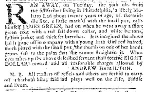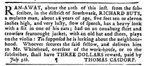The Slavery Adverts 250 Project chronicles the role of newspaper advertising in perpetuating slavery in the era of the American Revolution. The project seeks to reveal the ubiquity of slavery in eighteenth-century life from New England to Georgia by republishing advertisements about enslaved people – for sale as individuals or in groups, wanted to purchase or for hire for short periods, runaways who liberated themselves, and those who were subsequently captured and confined in jails and workhouses – in daily digests on this site as well as in real time via the @SlaveAdverts250 Twitter feed, utilizing twenty-first-century media to stand in for the print media of the eighteenth century.