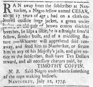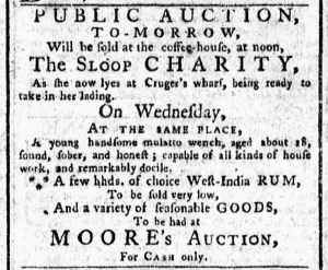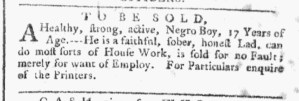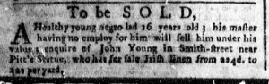 The Slavery Adverts 250 Project chronicles the role of newspaper advertising in perpetuating slavery in the era of the American Revolution. The project seeks to reveal the ubiquity of slavery in eighteenth-century life from New England to Georgia by republishing advertisements about enslaved people – for sale as individuals or in groups, wanted to purchase or for hire for short periods, runaways who liberated themselves, and those who were subsequently captured and confined in jails and workhouses – in daily digests on this site as well as in real time via the @SlaveAdverts250 Twitter feed, utilizing twenty-first-century media to stand in for the print media of the eighteenth century.