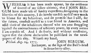 It was another confession accompanied with an apology. John Bergum, an “Innkeeper, at the sign of the Bull’s-head in Strawberry-alley” in Philadelphia, acknowledged his infraction and promised that he had reformed. Such items had been appearing among the advertisements in newspapers in Massachusetts for some time. For the past year, colonizers who signed an address to the former governor, Thomas Hutchinson, when he departed for England had reconsidered their position … or been pressured into recanting by Patriots who did not care for their Tory stance. More recently, similar advertisements appeared in newspapers outside of New England, especially after hostilities commenced at Lexington and Concord in April 1775.