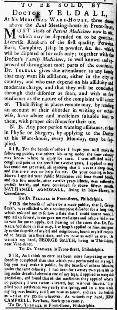 Doctor Yeldall apparently believed that testimonials worked. In June 1775, he published an advertisement that included several testimonials from his patients. Three months later, he once again promoted his “MEDICINAL WARE-HOUSE’ in Philadelphia with an advertisement that featured three new testimonials. The notice gave the impression that the doctor had not solicited them, but instead merely published letters addressed “To Dr. YELDALL in Front-Street, Philadelphia” at the request of those who sent them. “For the benefit of others I hope you will make the following public,” Nathan Agnomall’s testimonial began. Similarly, John Campbell, who had suffered “dreadful ulcers in one of my leges,” implored the doctor: “I beg you may make it public, for the benefit of others labouring under the same calamity” that Yeldall’s medicines healed leg.