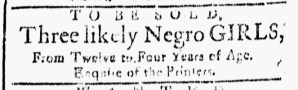 The Slavery Adverts 250 Project chronicles the role of newspaper advertising in perpetuating slavery in the era of the American Revolution. The project seeks to reveal the ubiquity of slavery in eighteenth-century life from New England to Georgia by republishing advertisements about enslaved people – for sale as individuals or in groups, wanted to purchase or for hire for short periods, runaways who liberated themselves, and those who were subsequently captured and confined in jails and workhouses – in daily digests on this site as well as in real time via the @SlaveAdverts250 Twitter feed, utilizing twenty-first-century media to stand in for the print media of the eighteenth century.