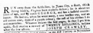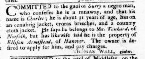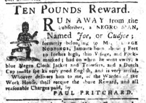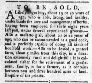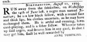 The Slavery Adverts 250 Project chronicles the role of newspaper advertising in perpetuating slavery in the era of the American Revolution. The project seeks to reveal the ubiquity of slavery in eighteenth-century life from New England to Georgia by republishing advertisements about enslaved people – for sale as individuals or in groups, wanted to purchase or for hire for short periods, runaways who liberated themselves, and those who were subsequently captured and confined in jails and workhouses – in daily digests on this site as well as in real time via the @SlaveAdverts250 Twitter feed, utilizing twenty-first-century media to stand in for the print media of the eighteenth century.