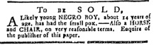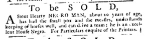 The Slavery Adverts 250 Project chronicles the role of newspaper advertising in perpetuating slavery in the era of the American Revolution. The project seeks to reveal the ubiquity of slavery in eighteenth-century life from New England to Georgia by republishing advertisements about enslaved people – for sale as individuals or in groups, wanted to purchase or for hire for short periods, runaways who liberated themselves, and those who were subsequently captured and confined in jails and workhouses – in daily digests on this site as well as in real time via the @SlaveAdverts250 Twitter feed, utilizing twenty-first-century media to stand in for the print media of the eighteenth century.