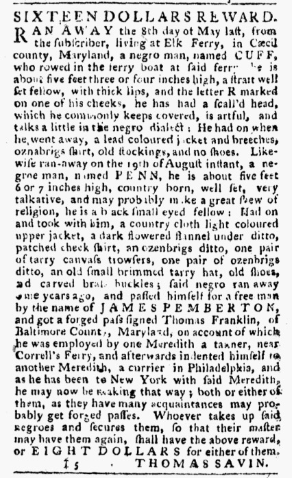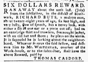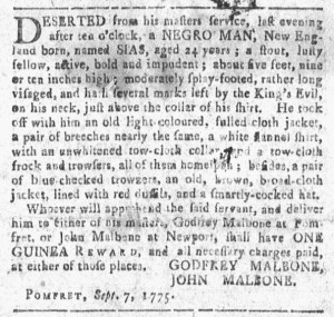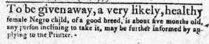 The Slavery Adverts 250 Project chronicles the role of newspaper advertising in perpetuating slavery in the era of the American Revolution. The project seeks to reveal the ubiquity of slavery in eighteenth-century life from New England to Georgia by republishing advertisements about enslaved people – for sale as individuals or in groups, wanted to purchase or for hire for short periods, runaways who liberated themselves, and those who were subsequently captured and confined in jails and workhouses – in daily digests on this site as well as in real time via the @SlaveAdverts250 Twitter feed, utilizing twenty-first-century media to stand in for the print media of the eighteenth century.