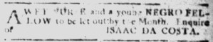 The Slavery Adverts 250 Project chronicles the role of newspaper advertising in perpetuating slavery in the era of the American Revolution. The project seeks to reveal the ubiquity of slavery in eighteenth-century life from New England to Georgia by republishing advertisements about enslaved people – for sale as individuals or in groups, wanted to purchase or for hire for short periods, runaways who liberated themselves, and those who were subsequently captured and confined in jails and workhouses – in daily digests on this site as well as in real time via the @SlaveAdverts250 Twitter feed, utilizing twenty-first-century media to stand in for the print media of the eighteenth century.
