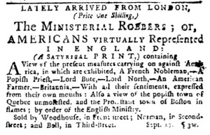 1. […] As the imperial crisis intensified and hostilities commenced in Massachusetts in the spring of 1775, American colonizers had supporters in London.  In addition, some artists, engravers, and printers, whatever their own politics may have been, hoped to generate revenue by creating and publishing political cartoons that lambasted the British ministry for the abuses it perpetrated in the colonies.  Some of those prints found their way to eager audiences on the other side of the Atlantic.  In the fall of 1775, William Woodhouse, a bookseller and bookbinder, John Norman, an architect engraver building his reputation, and Robert Bell, the renowned bookseller and publisher, advertised a “SATYRICAL PRINT” that “LATELY ARRIVED FROM LONDON.” The trio promoted “The MINISTERIAL ROBBERS; or, AMERICANS VIRTUALLY Represented IN ENGLAND,” echoing one of the complaints that colonizers made about being taxed by Parliament without having actual representatives serve in Parliament… …The advertisement indicated that the print also showed a “view of the popish town of Quebec unmolested, and the Protestant town of Boston in flames; by order of the English ministry.”  Those parts of the political cartoon unfavorably compared the Quebec Act to the Coercive Acts (including the Boston Port Act and the Massachusetts Government Act), all passed by Parliament in 1774.  The Quebec Act angered colonizers because it extended certain rights to Catholics in territory gained from the French at the end of the Seven Years War.  In the print, the town of Quebec sat high atop its bluff, the flag of Great Britain prominently unfurled, in the upper left with the “French Nobleman” and “Popish Priest” in the foreground.  Read more… […]
