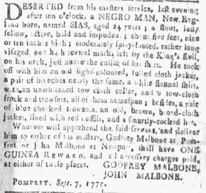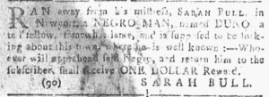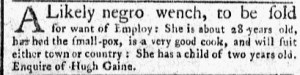 The Slavery Adverts 250 Project chronicles the role of newspaper advertising in perpetuating slavery in the era of the American Revolution. The project seeks to reveal the ubiquity of slavery in eighteenth-century life from New England to Georgia by republishing advertisements about enslaved people – for sale as individuals or in groups, wanted to purchase or for hire for short periods, runaways who liberated themselves, and those who were subsequently captured and confined in jails and workhouses – in daily digests on this site as well as in real time via the @SlaveAdverts250 Twitter feed, utilizing twenty-first-century media to stand in for the print media of the eighteenth century.