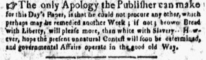 […] and advertising, on such occasions. That was the case on October 3, 1775, when he inserted an “Apology” that stated that “he could not procure any other” paper. Compared to the usual three […]