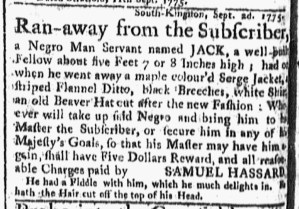 One of those advertisements, for instance, described a “Negro Man Servant named JACK” who fled from Samuel Hassard of South Kingstown, Rhode Island, at the beginning of September. He had managed to elude capture for a month. Hassard described Jack as a “well-built Fellow about five Feet 7 or 8 Inches high,” but did not indicate his approximate age. At the time he departed, he wore a “maple colour’d Serge Jacket, a striped Flannel [Jacket], black Breeches, white Shirt, [and] an old Beaver Hat cut after the new Fashion.” Hassard also mentioned that Jack “had a Fiddle with him, which he much delights in” and that he “Hath the Hair cut off the top of his Head.” Both details made Jack more easily recognizable to readers of the Connecticut Gazette.