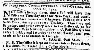Compared to Goddard’s advertisement, Bache’s notice gave readers a much more expansive glimpse of the scope of the enterprise. Rather than simply stating which days the post arrived and departed, Bache reported that the Constitutional Post carried letters and newspapers “as far as Portsmouth in New-Hampshire” to the north and “as far as Savannah in Georgia” to the south. The system linked the thirteen colonies. On Tuesdays, Thursdays, and Saturdays, a rider set out for New York from Philadelphia. On Tuesdays and Saturdays, another rider headed “to the Southward” to Baltimore, arriving there, according to Goddard’s advertisement, on Mondays and Thursdays. This new system did more than move mail. “Establishing a new post office,” Joseph M. Adelman argues, “placed the levers of information circulation in the hands of Americans. … Forming a ‘continental’ post office that could properly embody an intercolonial union and its resistance to imperial tyranny was crucial to Patriot mobilization at the height of the imperial crisis.” Furthermore, “Patriot printers and their radical friends” played an integral role in establishing the new postal system.[1] No wonder that Story and Humphreys placed Bache’s advertisement about the “PHILADELPHIA CONTSITUTIONAL POST-OFFICE” right after the “SHIP NEWS.”