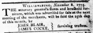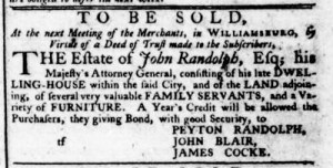 […] advertisement for the “Estate of John Randolph” that ran in John Dixon and William Hunter’s Vi… in the fall of 1775 also appeared in the other newspapers published in Williamsburg, John […]