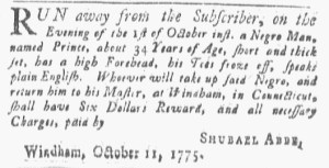 The Slavery Adverts 250 Project chronicles the role of newspaper advertising in perpetuating slavery in the era of the American Revolution. The project seeks to reveal the ubiquity of slavery in eighteenth-century life from New England to Georgia by republishing advertisements about enslaved people – for sale as individuals or in groups, wanted to purchase or for hire for short periods, runaways who liberated themselves, and those who were subsequently captured and confined in jails and workhouses – in daily digests on this site as well as in real time via the @SlaveAdverts250 Twitter feed, utilizing twenty-first-century media to stand in for the print media of the eighteenth century.