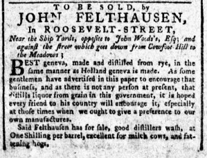 When John Felthausen wanted the public to know about the “BEST geneva [or genever], made and distilled from rye,” that he produced, he placed an advertisement in the October 23, 1775, edition of the New-York Gazette and Weekly Mercury. He declared that he distilled his spirits “in the same manner as Holland geneva is made,” assuring prospective customers of the quality and taste. To entice readers to purchase his genever, Felthausen reported that “some gentlemen have advertised in this paper to encourage that business” because “there is not any person at present, that distills liquor from grain in this government” or colony. In answer to colonizers who expressed a desire for someone to take responsibility for distilling genever and other spirits in New York, Felthausen suggested that they had a responsibility to support his business now that he accepted their charge to launch such an enterprise.